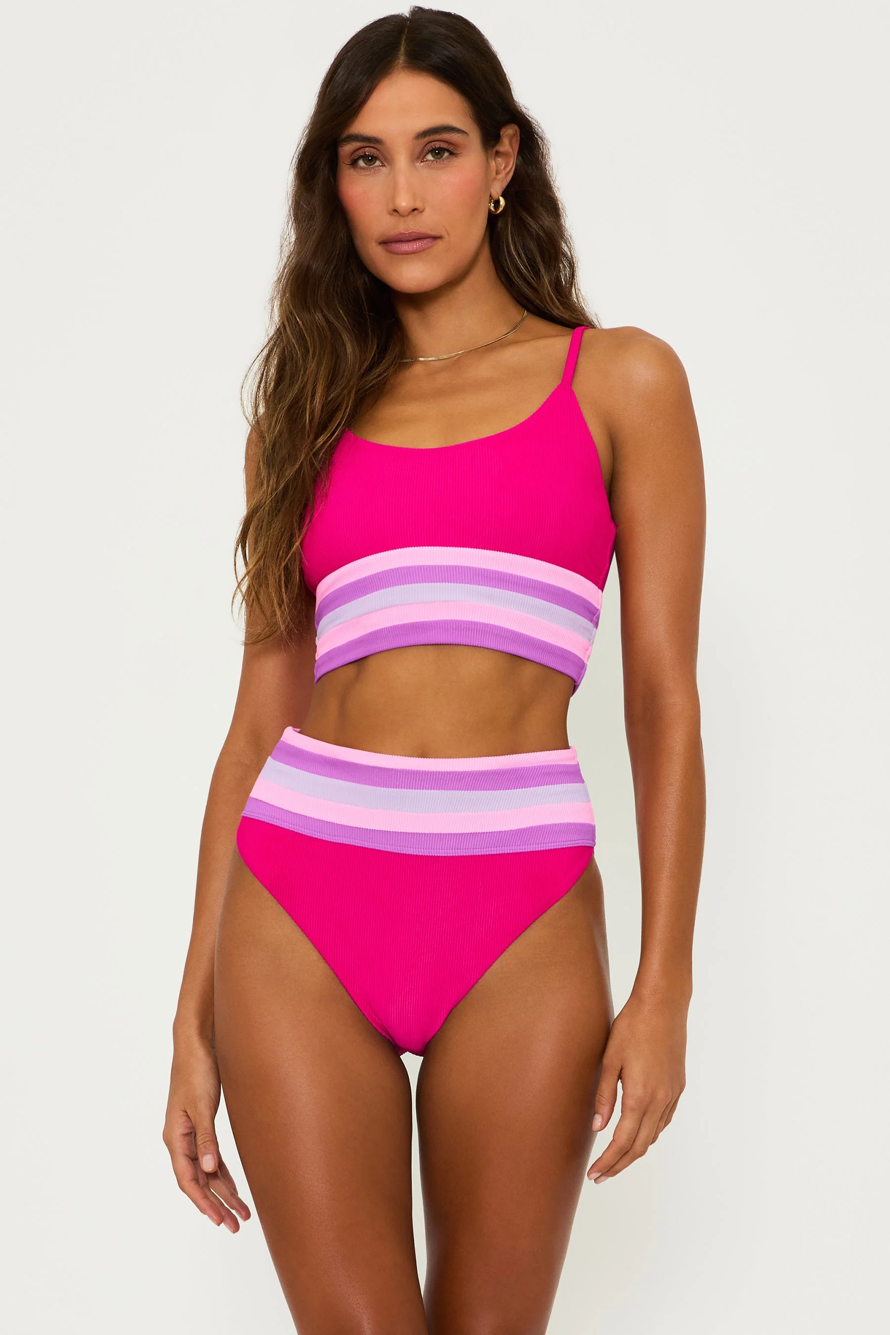 Turn heads at the beach or poolside with the Raspberry Colorblock Mae Top by Beach Riot. This bold and chic bikini top features a striking raspberry hue with contrasting pastel pink and lavender stripes, designed to enhance your look with playful sophistication. Made with a comfortable ribbed fabric, this top offers a seamless fit and stylish support. Perfect for mixing and matching with high-waisted bottoms or paired with matching Millie Bottoms for a complete set.
